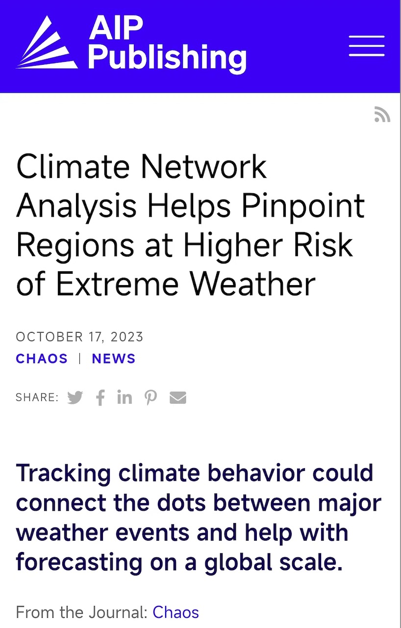 鉴于工作的重要性,论文被选为编辑推荐Editor pick文章,推荐文章Chaos每年仅约20篇,并被美国物理联合会(AIP)编辑推荐新闻记者采访并报道,相关内容以“Tracking climate behavior could connect the dots between major weather events and help with forecasting on a global scale.”为题刊登在AIP官网发表://publishing.aip.org/publications/latest-content/climate-network-analysis-helps-pinpoint-regions-at-higher-risk-of-extreme-weather/。 同时,美国《每日科学》(ScienceDaily)也报道了此项工作(见图3)。《每日科学》是美国科普文章专题新闻网站,与Nature、Science、Discovery、Scientific American等同列为十大科学网站,详情请见://www.sciencedaily.com/releases/2023/10/231017123342.htm.