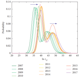 图2展示了全球平均综合贸易阻力的演化,不同的颜色对应不同的年份。可以看出,在2007-2017年间,全球平均贸易阻力有向右移动并逐渐增大的趋势,这表明世界整体的贸易关系在这十年间逐渐疏离恶化。其中左侧峰值(第一类)随时间的右移可认为是由于运输成本的整体升高。