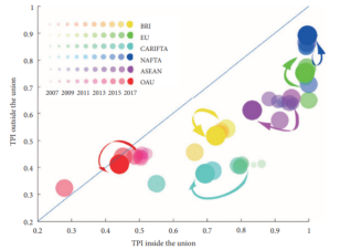 为了更准确地对国家间的贸易关系和各国的贸易环境进行量化描述,文章将每一对贸易关系隶属第一类(主要受自然因素影响)的概率加总并进行归一化处理,从而定义了贸易纯粹指数(TPI,Trade Purity Indicator)。该指数描述了真实的全球贸易环境和国家之间的贸易亲疏关系,并可以用来量化分析区域贸易协议对局域和全球贸易环境的作用。图3中的圆点代表六个典型的区域贸易协议:“一带一路”倡议(BRI)、欧盟(EU)、加勒比自贸区(CARIFTA)、北美自贸区(NAFTA)、东盟(ASEAN)和非盟(OAU),并展示了这些贸易集团内部及外部平均贸易纯粹指数随时间的变化(总体趋势由箭头方向表示)。图中,不同颜色代表不同的区域贸易协定,圆点的大小随时间推移而增大。可以看出,大部分圆点都位于对角线下方,说明集团内部的贸易关系要普遍好于集团外部。其中,“一带一路”倡议、加勒比自贸区、东盟、非盟等协议的贸易纯粹指数主要向左下方变化,表明其内部和外部的贸易关系均有一定程度的疏离;而欧盟和北美自贸区的贸易纯粹指数主要垂直向上变化,表明其成员国与集团外部的贸易关系变得更加友好。这表明,尽管全球和大多数区域贸易关系在2007-2017年期间均有疏离的趋势,但区域贸易协定仍改进了部分区域的贸易关系,特别是促进了欧盟和北美自贸区主要成员国的相对繁荣。