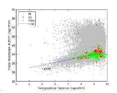 本文通过贸易流量建立全球贸易复杂网络,以此为基础挖掘各国之间的贸易关系和结构,及其随着时间的演化趋势。文章定义了综合性多边贸易阻力(成本),尝试使用期望最大化算法优化参数,并将国家间的综合贸易阻力分解为自然因素和人为因素两类(图1):第一类贸易阻力主要由自然因素构成,并与地理距离成正向关系;第二类贸易阻力要高于自然因素所能解释的部分,可以认为是由政策、关税等人为因素所造成的贸易障碍。例如,美国和其他多数国家的贸易关系(红色)均在r=f(d)直线附近,其贸易亲疏关系可以通过地理距离来体现,这也意味着美国和多数国家的贸易阻力属于第一类,主要受自然因素影响,没有明显的人为障碍。同样,中国和其他多数国家也有较为“纯粹”的贸易关系(绿色),大多可归为无明显人为障碍的第一类。