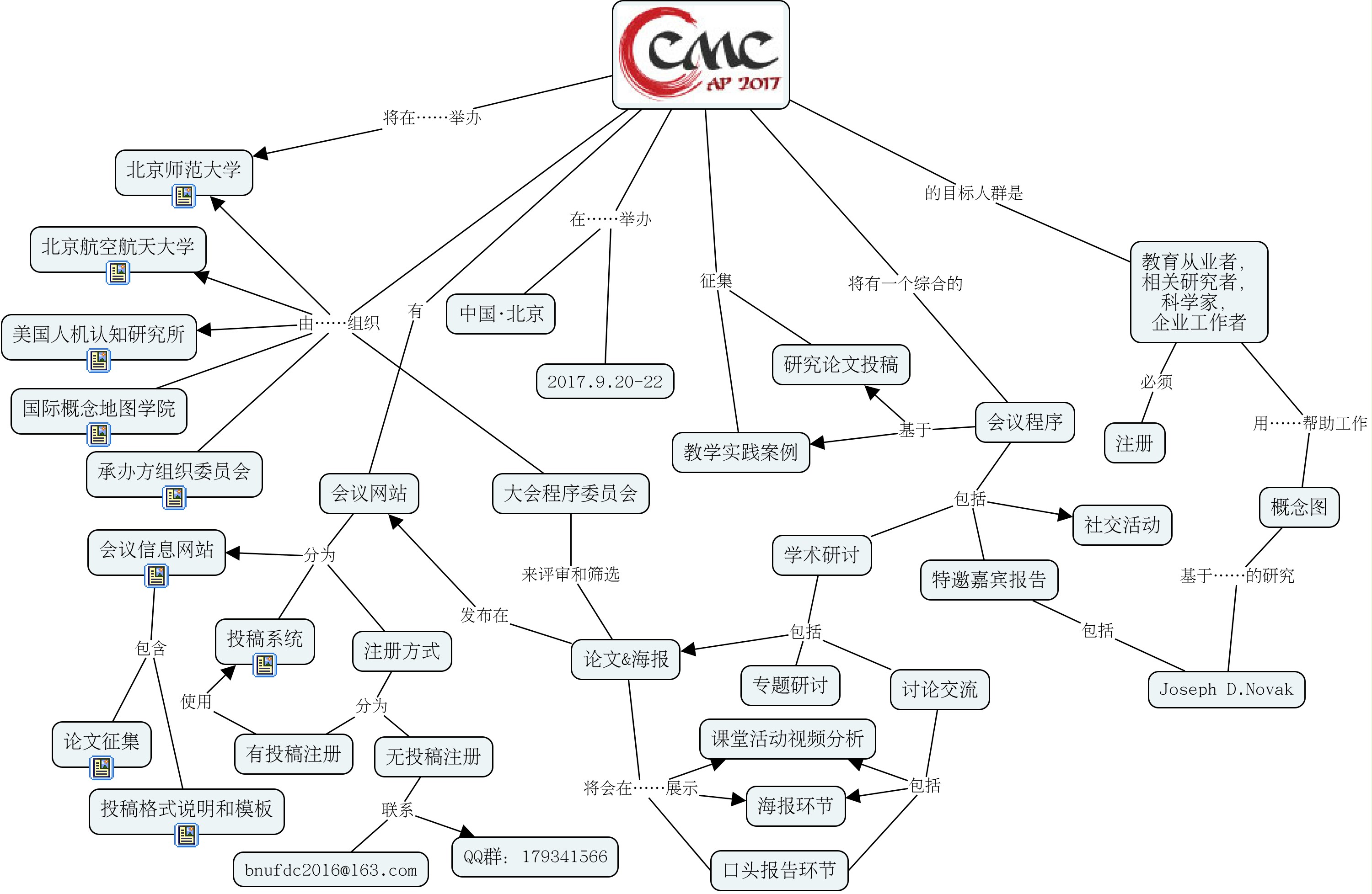 此前,在潘普洛纳(西班牙)、圣何塞(哥斯达黎加)、塔林(爱沙尼亚)/赫尔辛基(芬兰)、比尼亚德尔马尔(智利)、瓦莱塔(马耳他)、桑托斯(巴西)和塔林(爱沙尼亚)已成功举办了七届国际概念图大会,大会将来自世界各地的学者和对概念图感兴趣人都聚集在一起。考虑到亚太地区最近用户数量的不断增加,首届亚太概念地图会议也被视为第七届国际概念地图会议的区域延伸。这将是另一个给所有概念图使用者和研究人员分享想法的平台,特别是针对亚太地区。本次会议由万博体育app 、北京航空航天大学和美国人机认知研究所联合组织。 (点击下面链接,可以查看对应的学术计划和论文:cmc2004,cmc2006,cmc2008和cmc2010,cmc2012,cmc2014和cmc2016。所有会议录可以从CMC会议记录页面下载)。