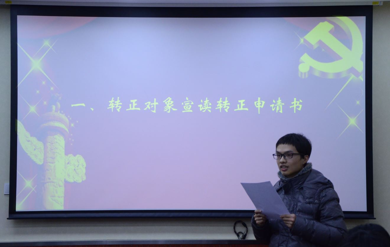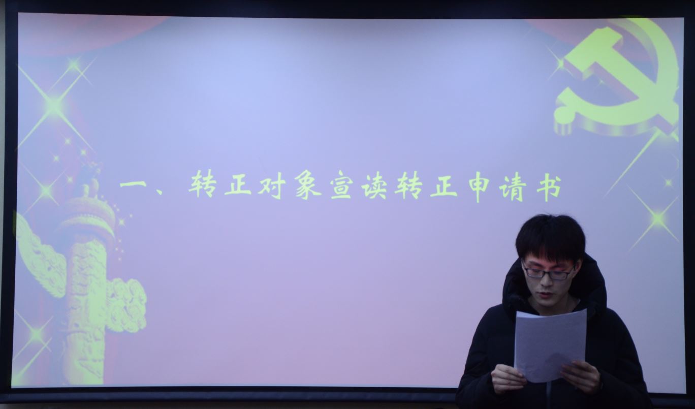 大会开始之后,首先全体起立,唱国际歌。然后根据预备党员转正会议流程,徐翊焜同志和崔浩川同志逐一宣读了转正申请书,支部委员介绍两位同志成为预备党员一年来学习、生活、工作等方面的情况。支部大会讨论过程中,与会党员积极、客观地对两名同志进行评价。随后正式党员投票表决,组织委员刘艳老师宣布支部决议,徐翊焜同志和崔浩川同志正式成为一名中国共产党员。