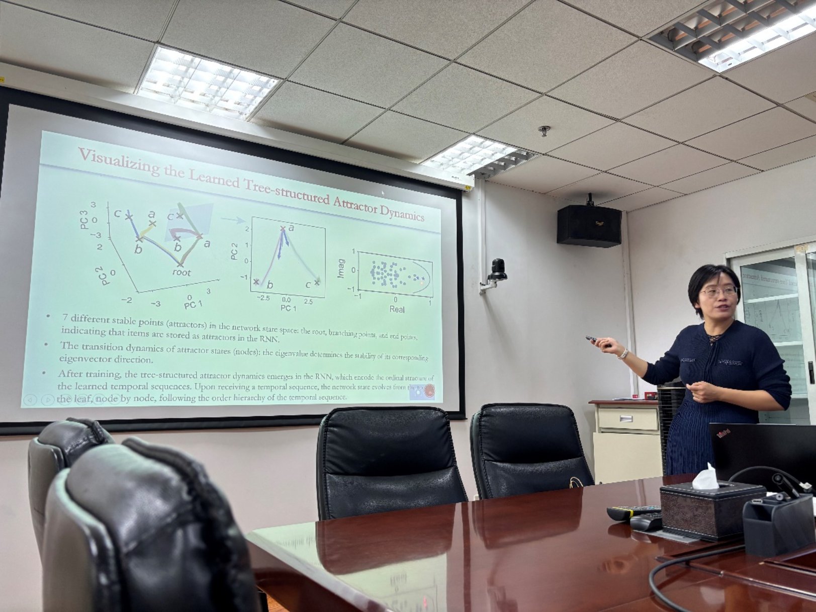 首先,弭元元教授介绍了时空模式识别的两大挑战:如何整合时间和空间信息以及如何整合顺序信息。基于此,弭老师介绍了她最近的两个研究工作。在第一个工作中,利用库网络模块模拟视网膜,保存活动模式,决策模块模拟上丘,通过监督学习训练库网络与决策模块之间的连接,发现在真实的范例(如Looming刺激、步态识别等)中,该模型与与其他深度学习算法相比,表现是最好的。在第二个工作中,弭元元教授及其课题组探究了循环神经回路是如何表示时间序列的抽象顺序结构的,经过适当的训练,模型能够学习树形结构顺序,且这个抽象的时间顺序模板并不依赖于具体的内容特征,更多是在抽象层面上的语句拓扑和几何结构的结构性表达。随后通过迁移学习任务的消融实验,证明如果新的时间序列与已有时间序列共享相同或部分相同的拓扑结构,那么时间序列模板的重复使用可以显著加速新时间序列的学习,证明了抽象结构表征的学习在时间序列学习过程中重要性。