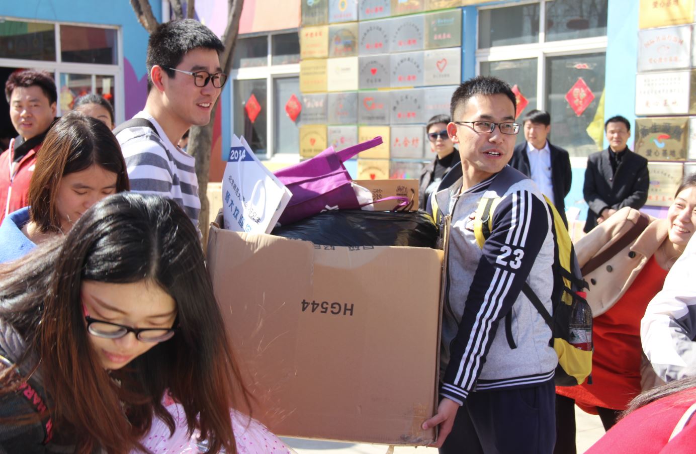 1996 年,张淑琴女士顶住多重压力,在陕西创办了第一个替服刑人员代养、代管、代教子女的太阳村。10年过去了,在张淑琴的不懈努力和国内外爱心人士的帮助下,她相继在陕西、北京和河南等地创办了9个太阳村,现已代养、代教服刑人员的子女6000余名。现负责人武海燕女士说,往日太阳村一天最多接待400名爱心人士,今天却来了700余人,这让这个不算大的村落显得格外拥挤。北师大学生们自发地将衣物、食品分拣开来,并搬运入库,对食品物资还按照当地的储藏规则进行细分、排列、规整,着实减少了太阳村工作人员的工作压力。
