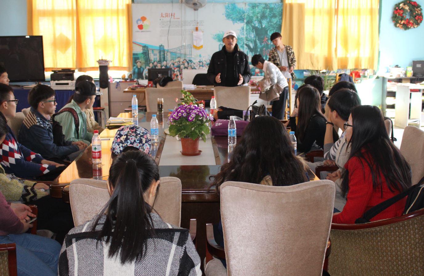 在下午的座谈会中,负责人武海燕女士向大家讲述了太阳村的现状,让大家了解到,太阳村目前以自身建设的果树种植基地和社会爱心人士的捐助作为资金来源,组织孩子们在附近的学校读书。活动负责人马玉财向武海燕介绍了北师大研究生共建党支部本学期计划在太阳村开展的系列公益活动的初步策划,并组织大家就活动策划与武海燕展开讨论。武海燕表达了对北师大学子热心公益的感谢和赞扬,与大家探讨了活动方案,并真诚地邀请北师大优秀学子帮助他们改善太阳村现行志愿者制度。会后,北师大研究生共建党支部向太阳村负责人赠送了代表师大文化的校训卷轴,以表达支部成员对于该公益组织的敬意,并合影留念。