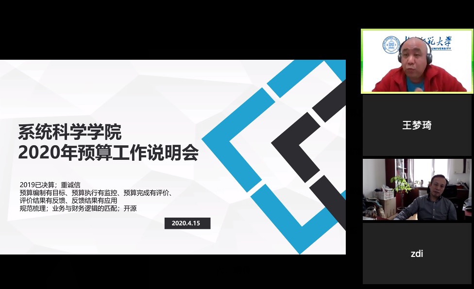 为了进一步明确系统科学学科十四五发展规划编制的思路及要求,推进学院各项制度、规划的编制工作,规范学院预算绩效管理制度并使预算工作有序开展,2020年4月15日上午,万博体育app 召开全体教师大会视频会议。会议由党总支书记狄增如主持,全院教师参加了会议。