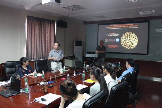 2016年6月10日下午,Guy Theraulaz教授在万博体育app 英东楼217会议室做了题为“群体建筑之秘密:破译蚁群的建筑法则”首场讲座。报告介绍了蚂蚁如何建造具有复杂结构的巢穴;如何通过巢穴中的通讯网络进行快速的信息交流。报告还介绍了Guy Theraulaz教授课题组的一个基于信息素的模型来模拟蚁群筑巢,模拟的结果与实际巢穴具有相似的空间结构。