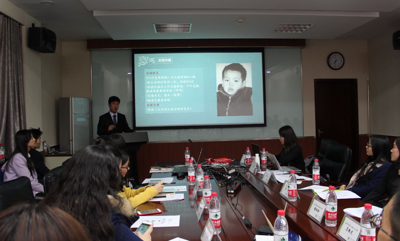 接下来,活动负责人马玉财为与会成员详细介绍了本次活动策划。活动地点在北京太阳村,太阳村作为非政府的慈善组织(NGO),十多年来以无偿代养、代教服刑人员无人抚养的未成年子女为己任,依靠自身建设的果树种植基地和社会爱心人士的捐助作为资金来源。在活动组织方面,除却来自16个院系的20个研究生党支部,本次活动还联合了北京荣耀爱心志愿者服务队、哲学学院研究生会等组织共同参与。在活动流程方面,设置了开幕式、支部共建公益活动、校内义捐义卖、校内总结闭幕等9项子活动。随后他对大家汇报了活动前期准备工作,包含喷绘、横幅、旗帜等宣传物品制作、前期太阳村的实地走访等。同时,他向大家强调了本次活动的注意事项和志愿者守则,尤其是活动中要用心对待太阳村的孩子们,不要刻意打扰他们原本的生活。