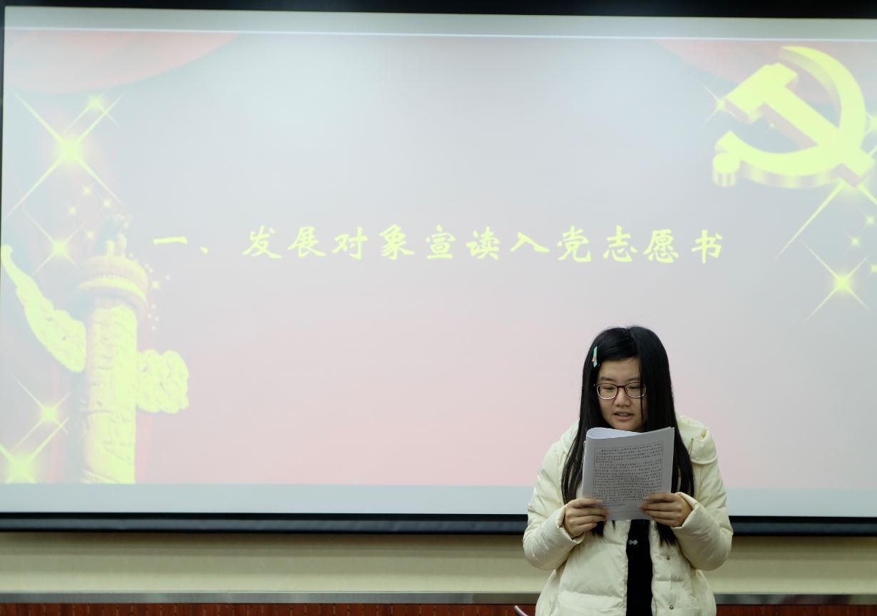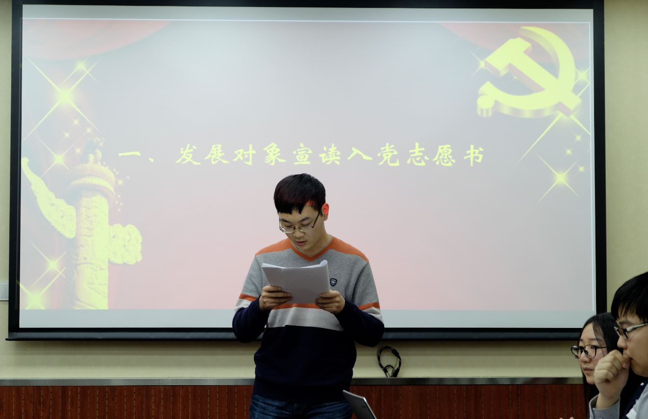 大会开始之后,首先全体起立,唱国际歌。然后根据接受预备党员会议流程,三名发展对象逐一宣读了入党志愿书,表明了自己加入共产党的决心。支部大会讨论过程中,三名发展对象的入党介绍人分别介绍了三位同学在日常学习和生活中的表现以及存在的优缺点,表明三位同学符合党员标准;随后支委会报告了对发展对象的审查情况;与会党员发表意见的过程中,在场的教师和同学除了对三位发展对象的日常表现做出肯定之外,还向三位发展对象提出了很多问题,比如狄增如老师提到“如何看待党的发展中经历的许多挫折和磨难”,蔡维老师提到“结合十八大召开的背景,有没有感觉现在入党是一个入党的好的时机”等,三位发展对象认真的回答了这些问题,这些问题也引起了在场党员们的思考。随后正式党员投票表决,最终组织委员刘艳老师宣布支部决议,三名同学正式成为预备党员。
