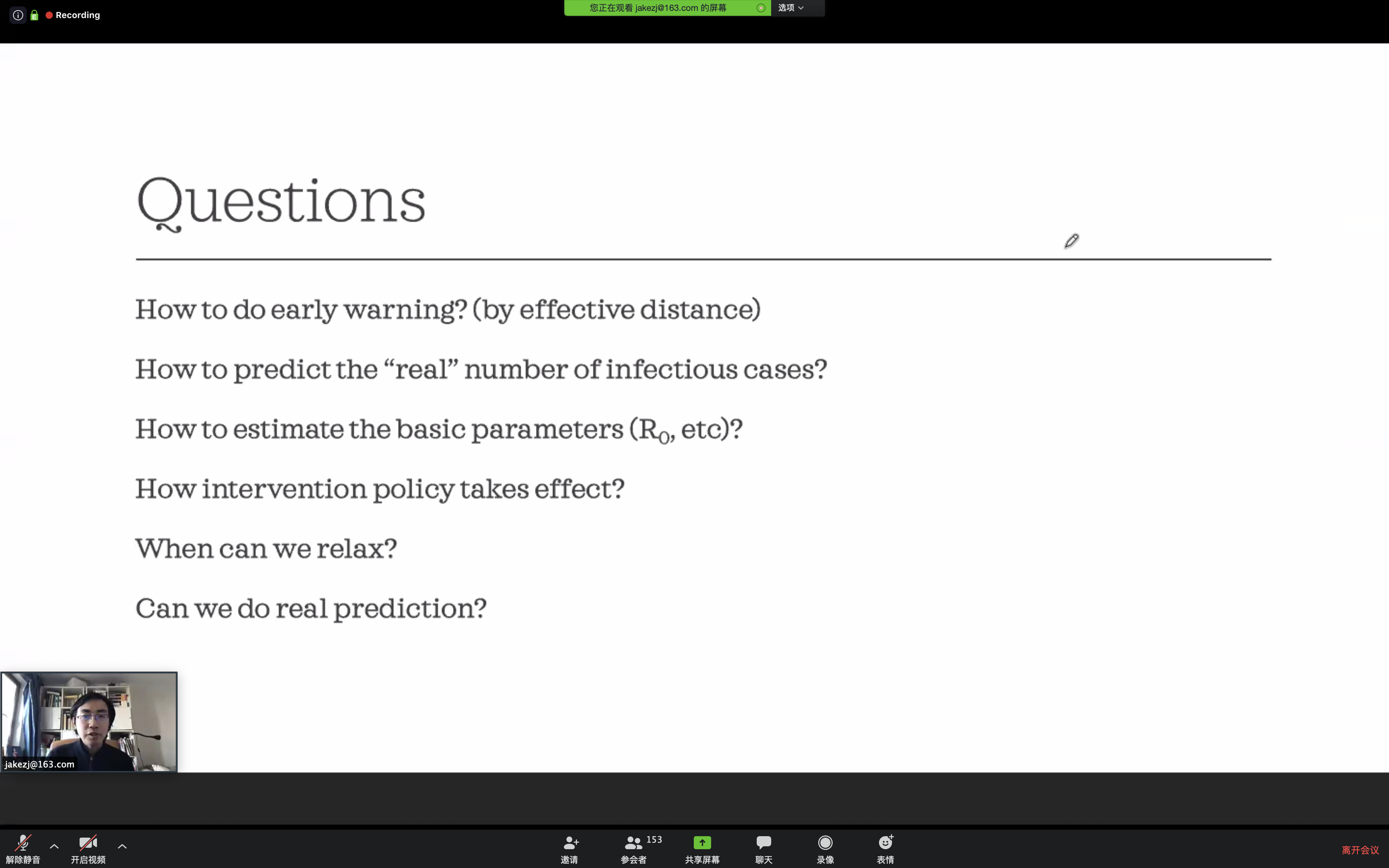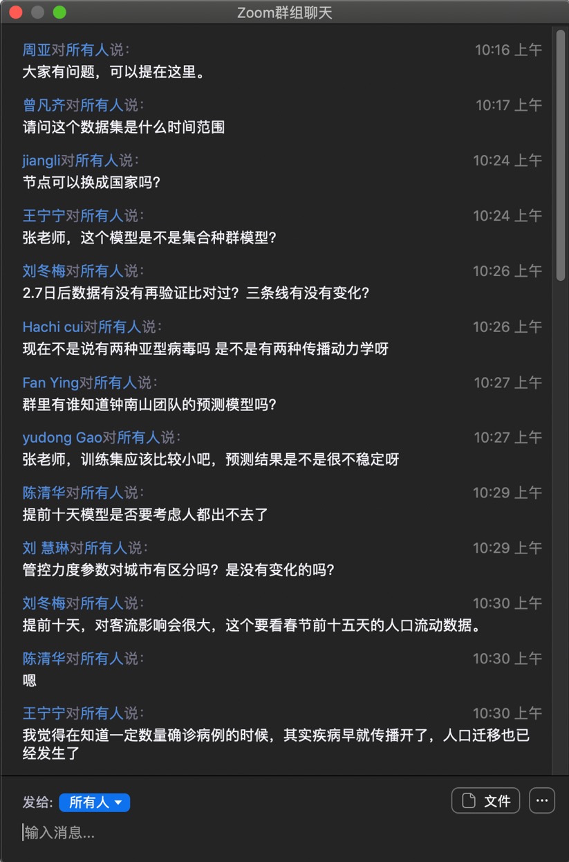 随后,与会的各位师生就这些问题展开了热烈讨论。万博体育app 的陈晓松教授、狄增如教授、李红刚教授、韩战钢教授、斯白露教授、樊瑛教授、王大辉教授等,以及地理科学学部的汪明教授、叶谦教授都发表了精彩点评,对于如何提出与疫情相关的、有系统科学特点的科学问题,如何在数据有限的情况下提升科学决策水平,如何将系统科学与安全工程、应急管理相结合,提出了自己的见解与主张。会议的讨论区也收到了200多条留言,师生进行了充分讨论。