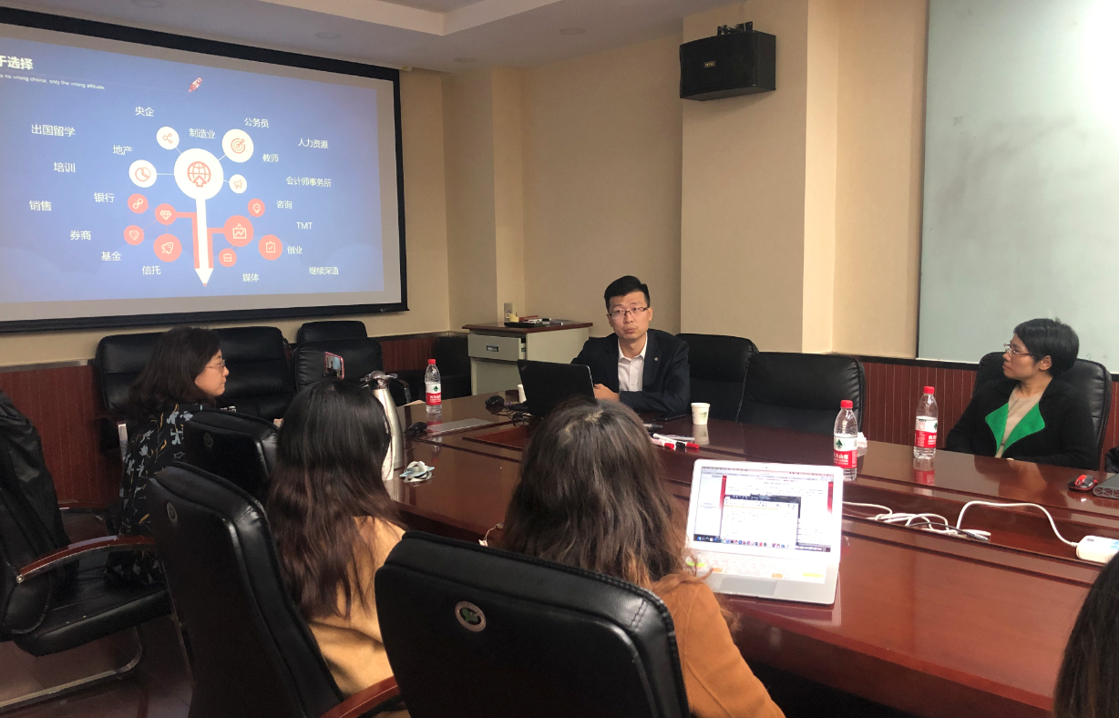 随后,王心牧学长以“选择和态度”为题,结合自己在招商银行十年的成长经历,给大家生动的上了“坚持与奋进、责任与成长”一课。王心牧学长告诉大家,“在对未来职业发展做规划时,要综合考虑社会需求度、求职竞争性、个人匹配度、职业发展潜力、环境因素和个人兴趣这几方面的因素,学长鼓励大家在走出校园前,要注意培养自身的综合素质和基本的职场素养。踏实奋进、持之以恒是师大学子的优良传统,学长希望在座的同学们将来能够在未来的职业发展中彰显师大学子的资质和系统院友的素养,同时在踏入社会时,要更加自信和从容,王心牧学长真诚的希望有更多的同学能够投身金融行业,志存高远,脚踏实地,青出于蓝而胜于蓝。