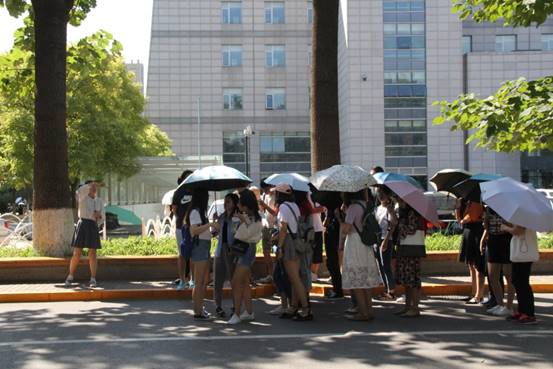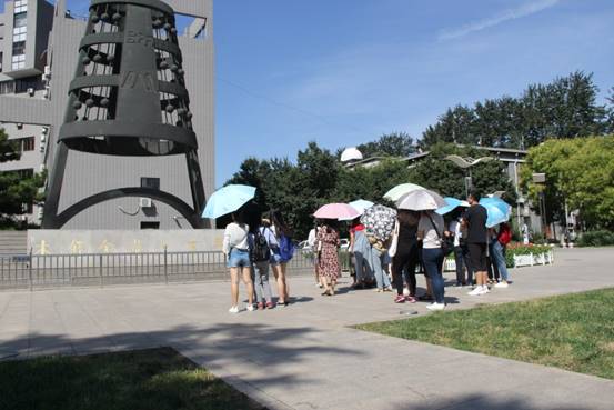游览路线始于科技楼,接着参观图书馆、主楼,以及周边的教学楼。主楼作为我校百年标志性建筑群的重要组成部分,整体呈现的“工”字型更是彰显了庄严神圣。随后去到京师广场,在木铎前,志愿者以一句“天下之无道也久矣,天将以夫子为木铎”,让大家认识到师大将木铎作为标志以示匡天下的决心,更深刻地理解了校训“学为人师,行为世范”。